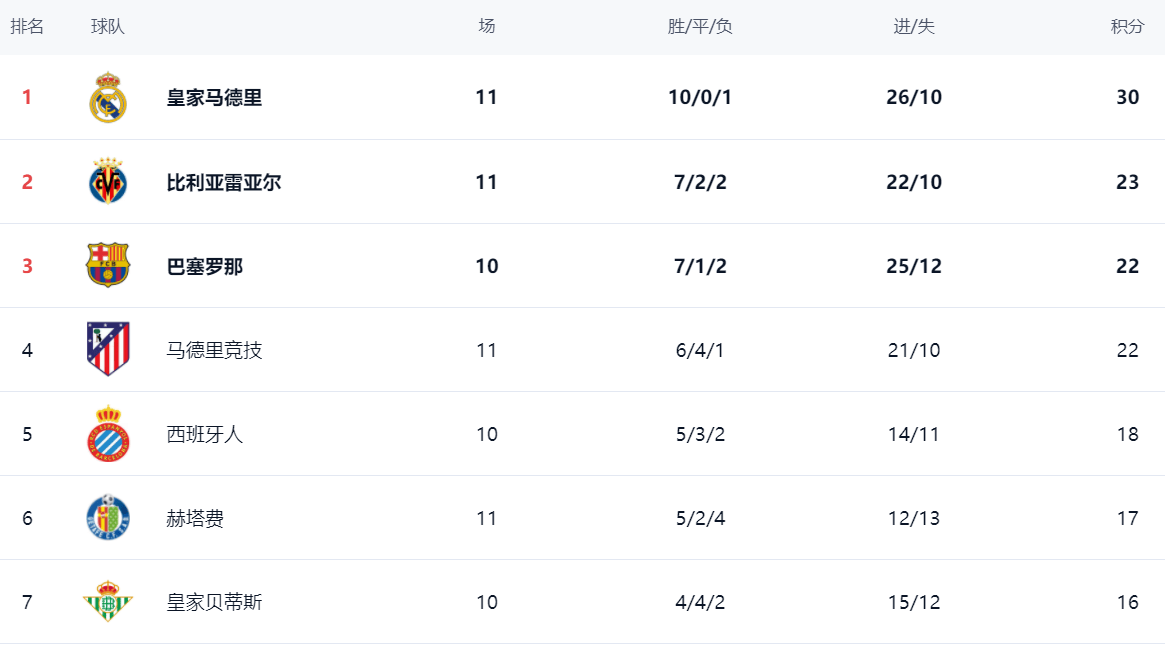 目前,皇马以10胜1负的出色成绩,积30分高居积分榜榜首。比利亚雷亚尔以7胜2平2负积23分,暂时排名第二。巴萨少赛一轮,积22分,排在第三。马竞同样拿到22分,由于净胜球劣势,排名第四。西班牙人积18分,位列第五。赫塔费则以17分排在第六位。