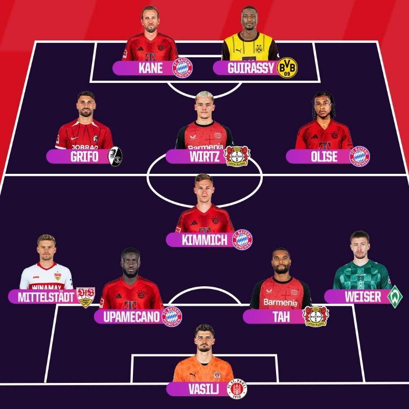 OPTA公布本赛季德甲最佳阵容:拜仁四人入选,人数最多