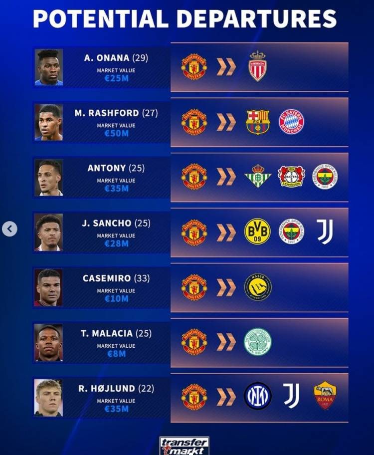 清洗冗员!德转列曼联潜在离队7人:拉什福德、安东尼、桑乔在列