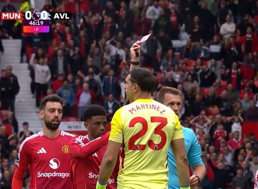 直播吧5月26日讯 英超收官战,力争进军下赛季欧冠的维拉客场对阵曼联。上半场尾声阶段马丁内斯出击放倒霍伊伦,被主裁判直红罚下。最终维拉0-2不敌曼联,无缘欧冠资格。